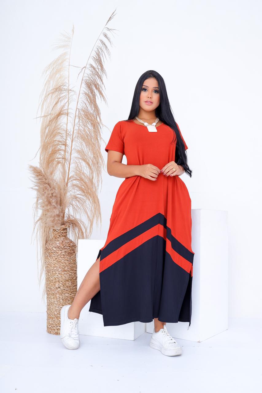 O vestido é midi e possui bolso nas laterais que o deixa mais lindo e confortável, além disso, tem uma combinação de cor incrível