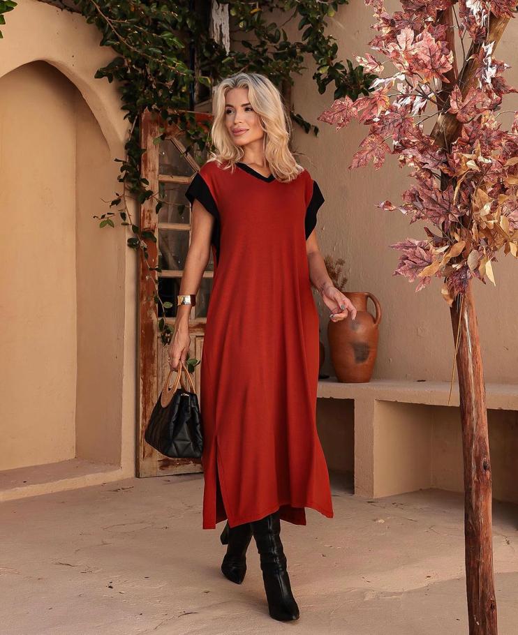 O vestido é longo, possui bolso nas laterais que o deixa mais lindo e confortável, além disso, tem manga morcedo e gola V com uma combinação de cores incriveis.